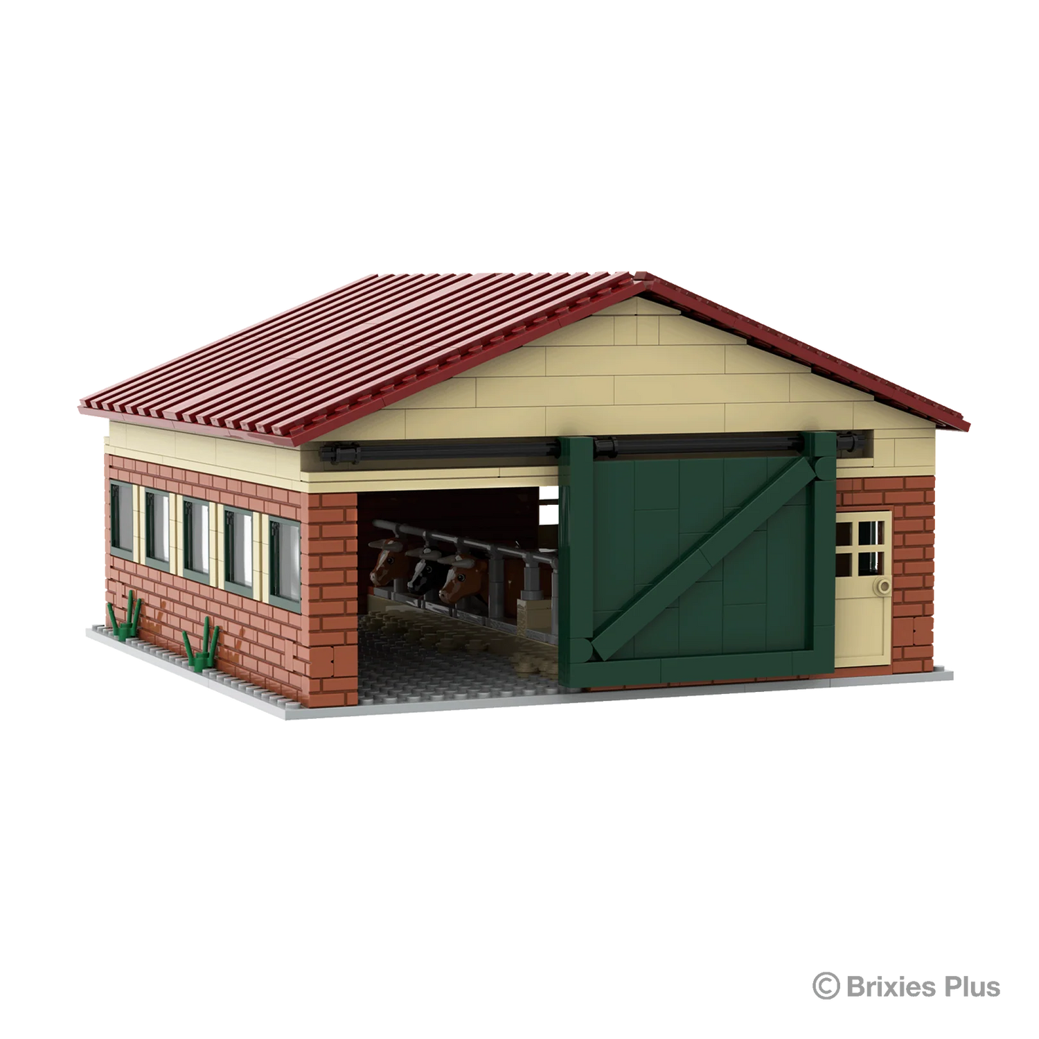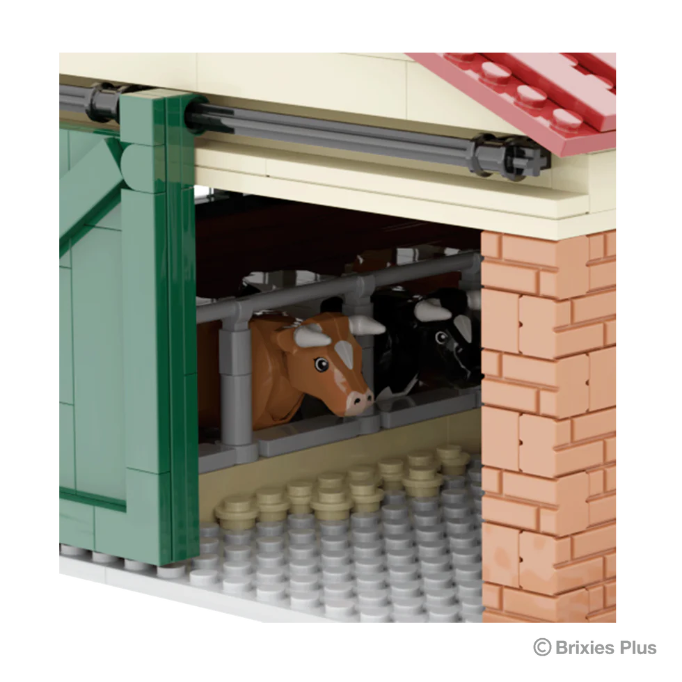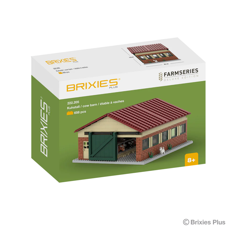 The BRIXIES Plus building kit "Cow Shed" consists of a total of approx. 635 bricks and, when assembled, is approx. 26.6 cm long, 13.9 cm wide, and 26.1 cm high.
