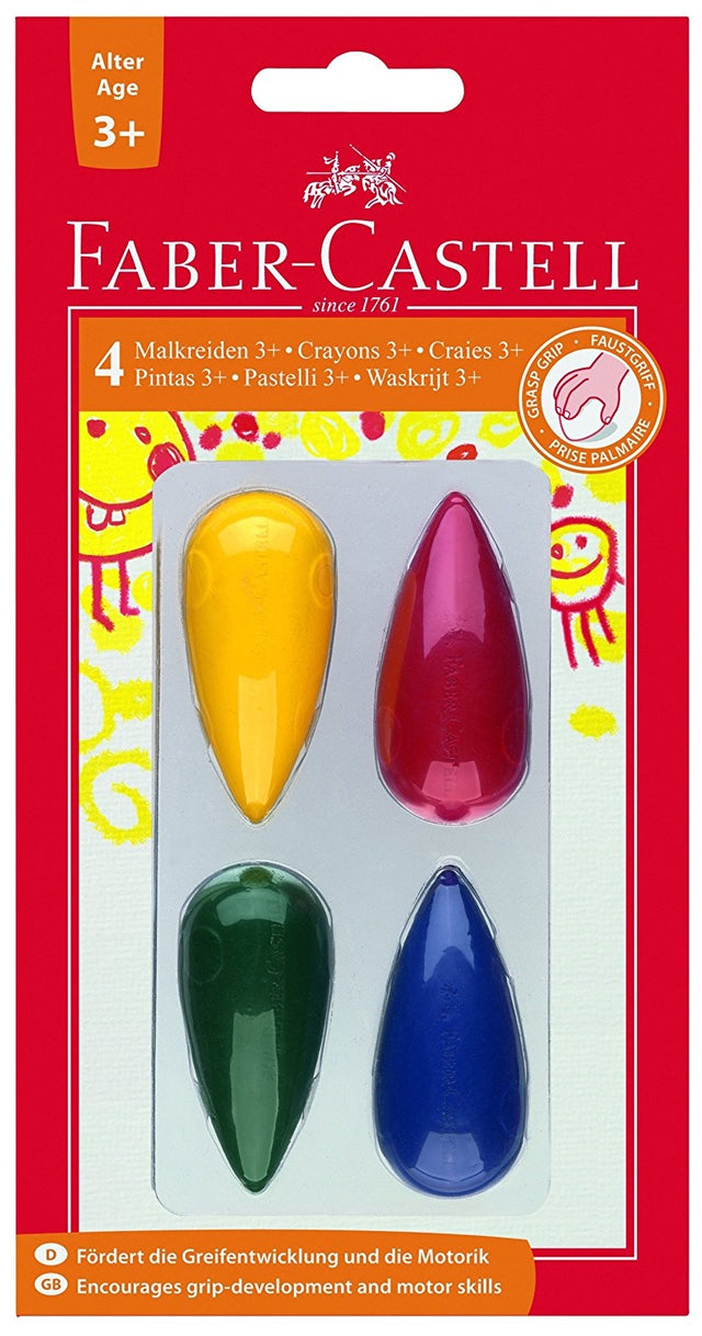 Budding artists between the age of 3 and 6 love to experiment by drawing on different surfaces. Crayons are a great way of drawing on large surfaces, with their soft stroke and bright colours. Their ergonomic finger shape makes the crayons 3+ ideal for children age 3 and above.They encourage the transition from a fist grip to a four-finger grip.The bright colours can be easily rubbed out with the eraser and little hands stay clean. Pack of 4 “bulb” shaped crayons.