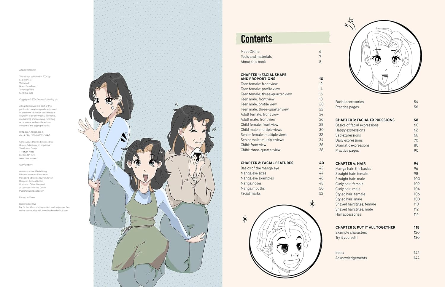 Beginning with facial shapes, moving to features and expressions, and ending with hairstyles, the final chapter gives prompts where the reader can combine all their newfound knowledge to create full portraits of their own.