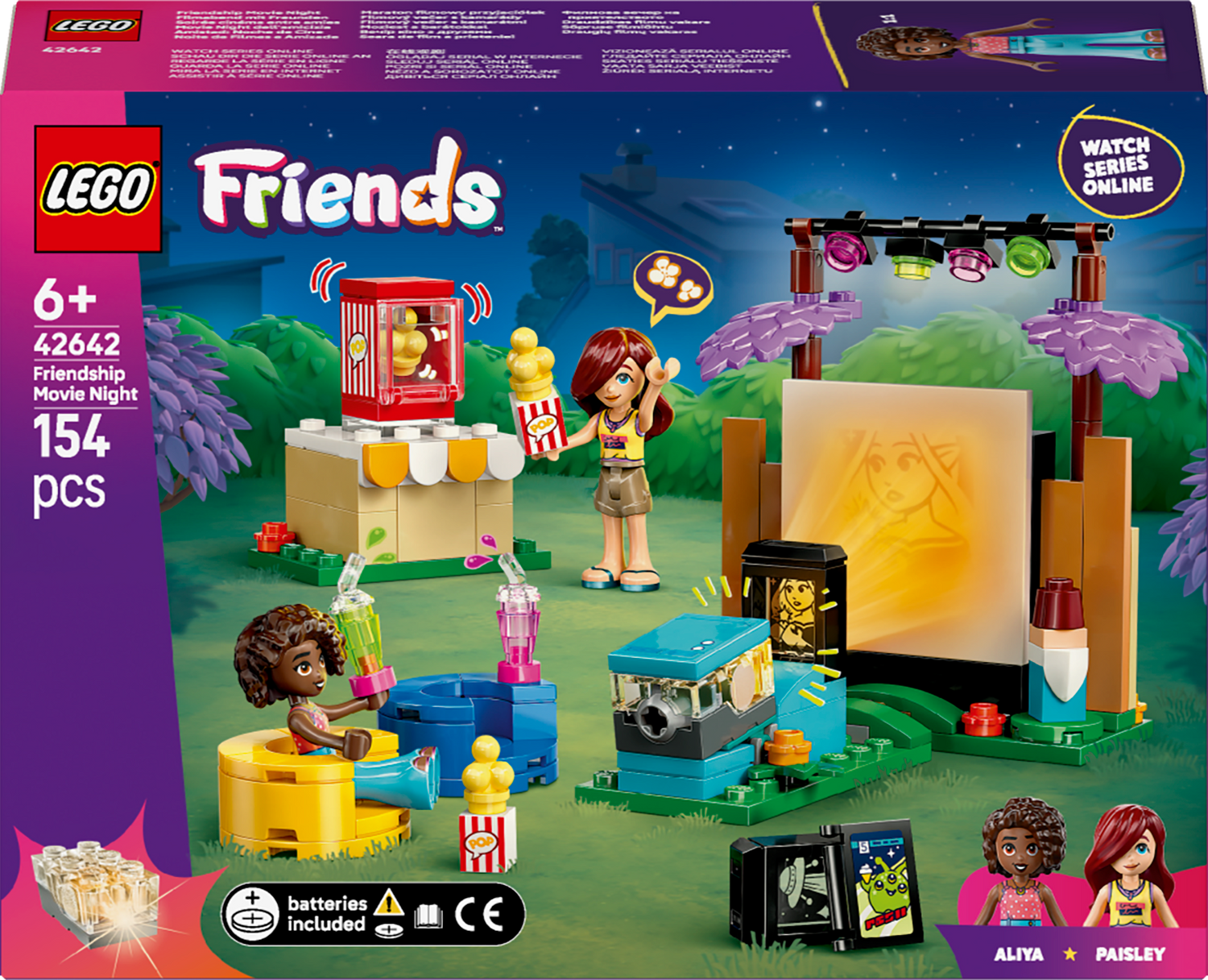 - 2 LEGO® Friends characters – This pretend-play toy comes with minidolls Paisley and Aliya, inspiring kids to create different social situations as the friends watch movies in Paisley’s garden