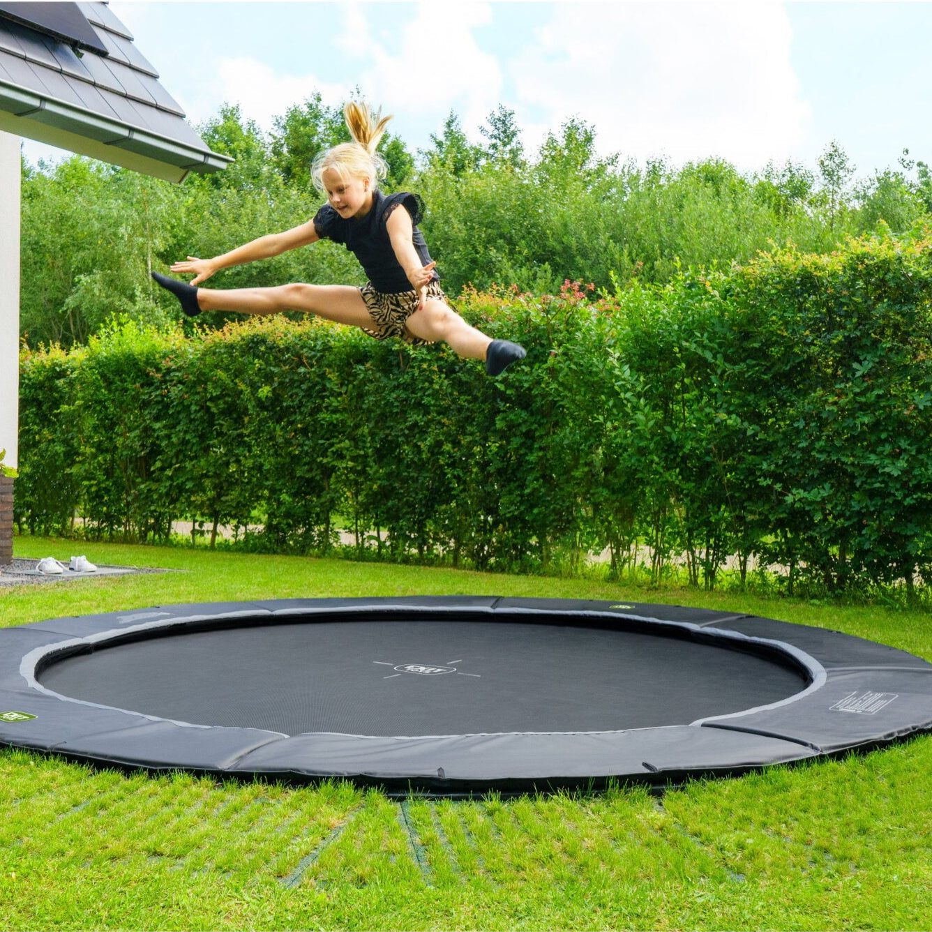The EXIT Dynamic 14 foot GroundLevel Trampoline is a round matt black inground trampoline.