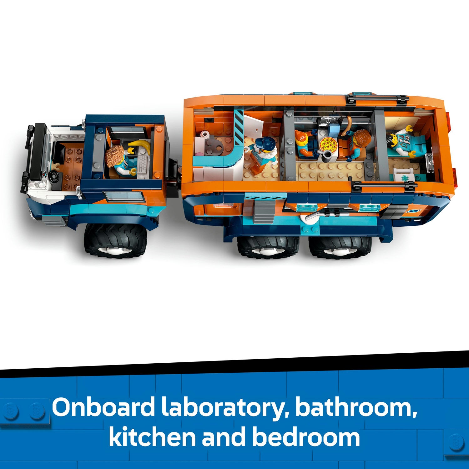 This realistic playset features an articulated toy truck with 6-wheel suspension, deep-tread tires and a rotating rooftop observatory, plus cool interior details including a driver’s cab, laboratory and cosy living area with a bathroom, kitchen and bedroom.