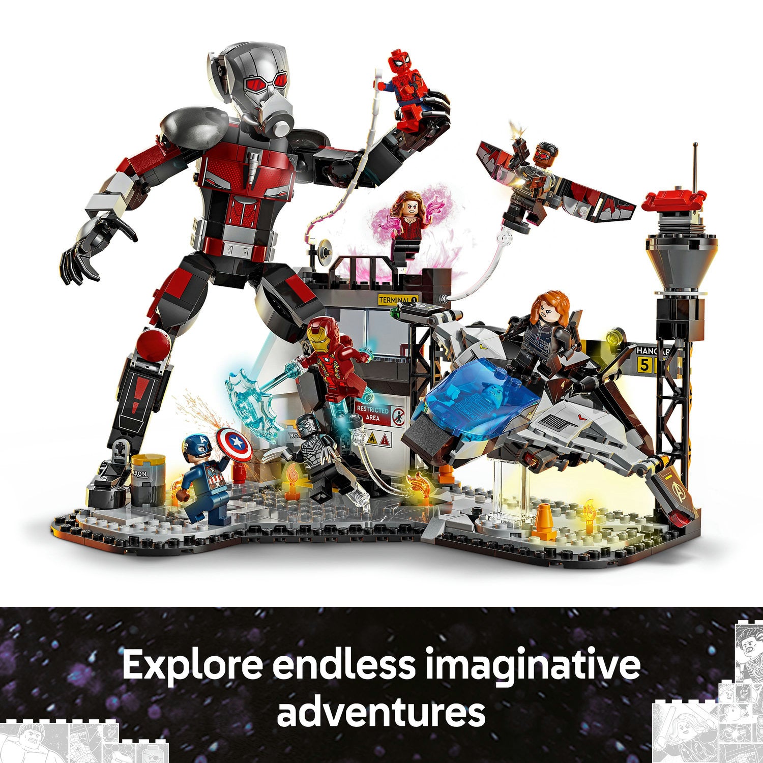 - LEGO® Marvel figures – Includes a large, fully jointed Ant-Man LEGO figure and 8 minifigures: Captain America, Winter Soldier, Wanda, Falcon, Iron Man, Spider-Man, Black Widow and Black Panther