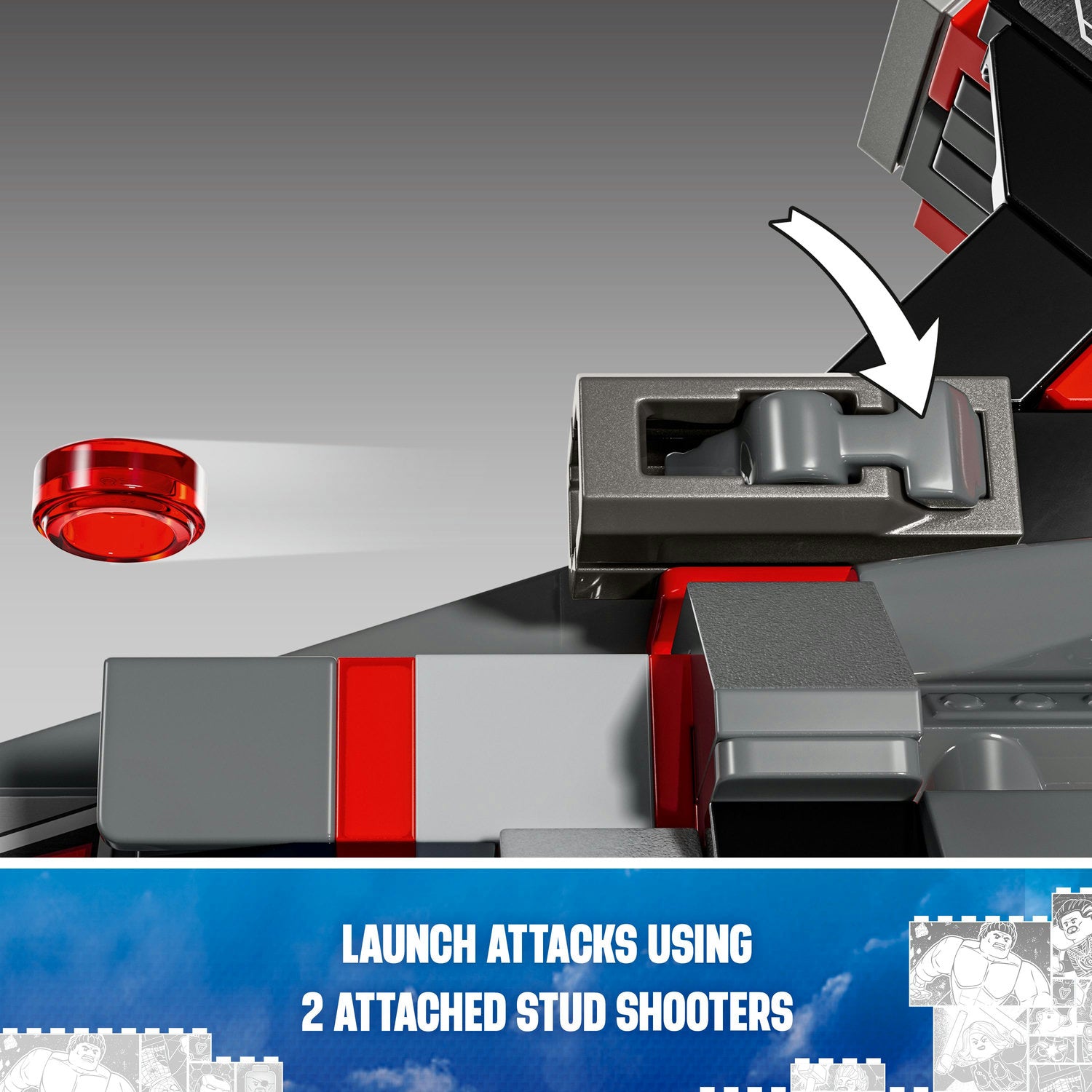 This fighter jet buildable toy includes an impressive cast of minifigures: Captain America and Falcon (both with opening wings), Red Hulk and Ruth Bat-Seraph. Featuring a large opening cockpit with room inside for a minifigure pilot, the jet is easy for kids to hold and fly around while they launch attacks using the 2 attached stud shooters.