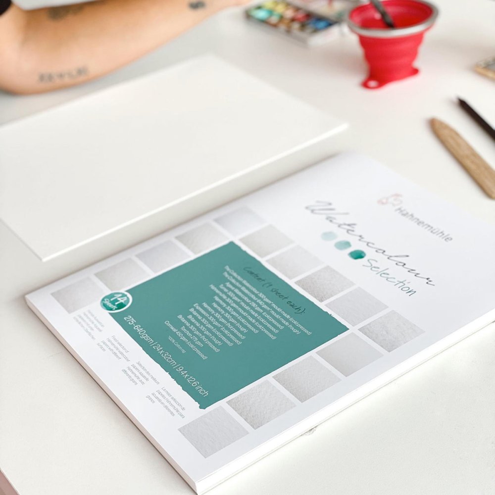 The Watercolour Selection pad contains a large selection of high-quality Hahnemühle watercolour papers with a variety of surfaces and grammages.