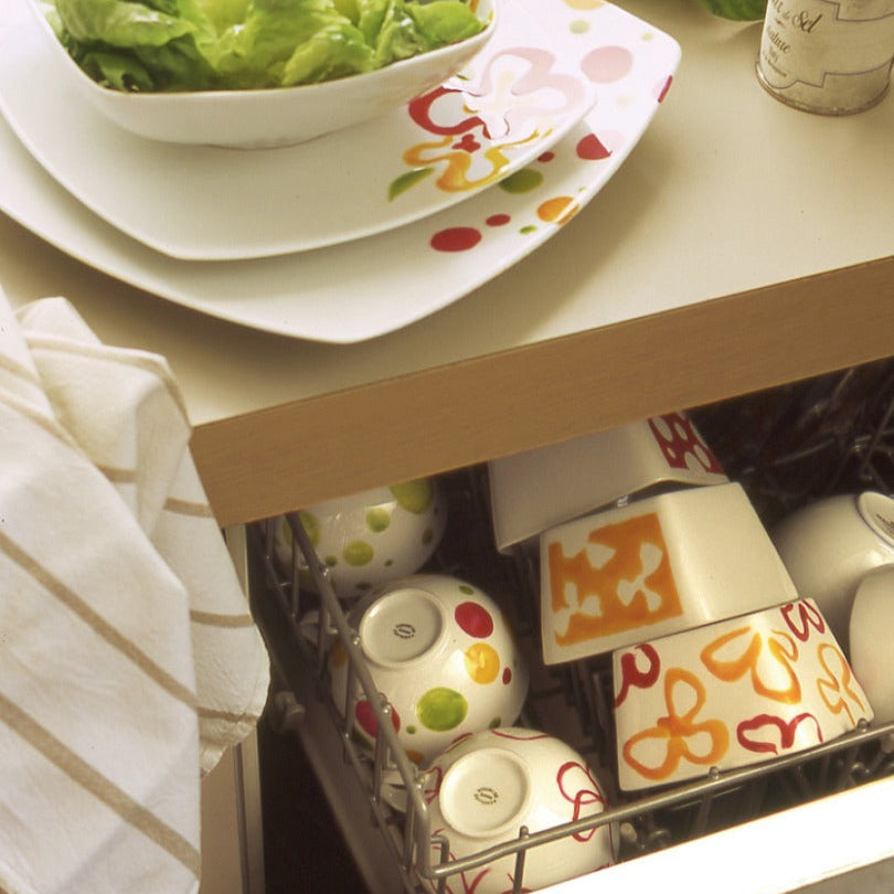 Air dry for 24 hours then bake for 35 minutes at 150°C for dishwasher safe use (as per label recommendations). Store flat. Does not freeze.