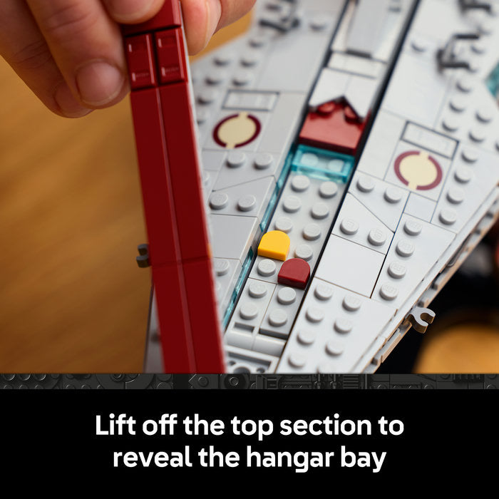 Use LEGO® bricks to recreate the distinctive silhouette and authentic details of one of the most versatile starships in the Galactic Republic’s fleet.