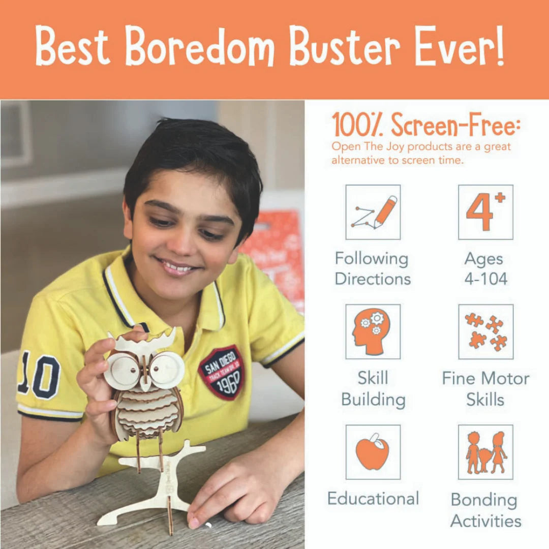 • Kit Includes: 60+ Page “Rainy Day” Activity Book, 13 Paint Pods (5ml), 2 Paint Brushes, Large Canvas (9x7in), Small Canvas (6x4in), 54 Piece Wooden Owl 3D Puzzle, 6-in-1 Jumbo Marker, 50 Sheets Assorted Colors Origami Paper, Googly Eye Hand Puppet, 6 Coloring Posters, Jumbo Origami Fortune Teller, Deck of “Would You Rather” Playing Cards