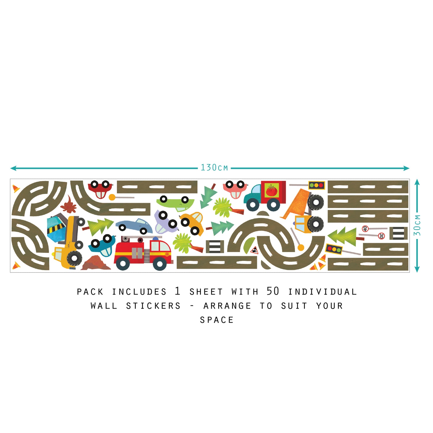 - The pack includes one 130 x 30cm sheet containing 50 individual transport themed wall stickers.