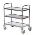 With pressed stainless steel shelves. Four 100mm diameter rubber tyred swivel castors. Capacity 100kg. Supplied in knock down form for easy assembly on site. Three shelves. L860 x W530 x H810mm. Non returnable.