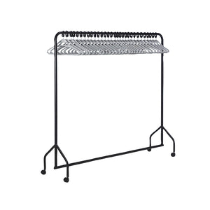 Epoxy coated tubular steel garment rail on castors. Easy to assemble. Supplied complete with 30 Grey Coat Hangers. L1830 x H1730 x D500mm. Colour - Black. Non returnable.