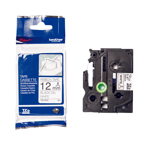 Brother P-Touch Ribbon Labelling Tape 12mm x 4m Black on White TZER231. Compatible with Brother P-touch label printers. Fabric ribbon with a luxury shiny finish. Perfect for present wrapping and craft. Size WxL: 12mm x 4m.