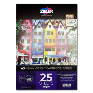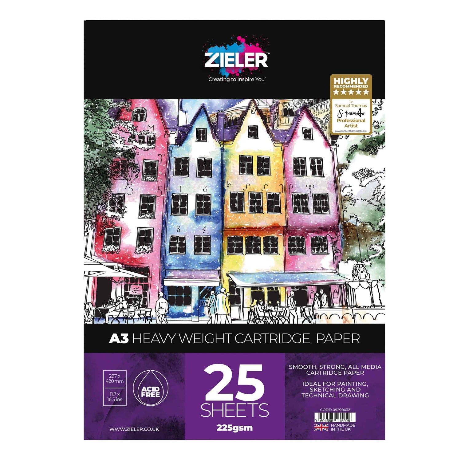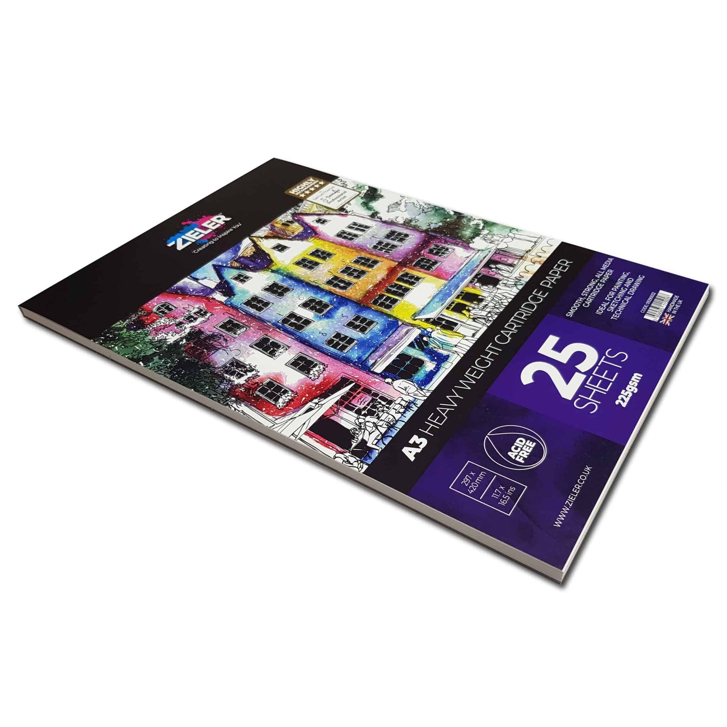 The A3 heavyweight cartridge pad by Zieler contains 25 smooth, high quality, heavy-duty sheets ideal for drawing and illustration, yet thick enough for markers, acrylic and light watercolour & gouache.