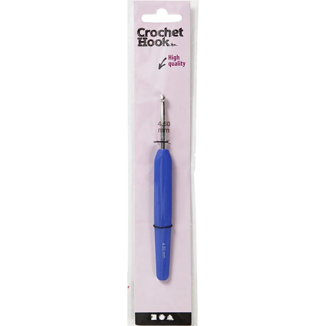 Ergonomic crochet hook made of aluminum, with soft touch plastic handle.