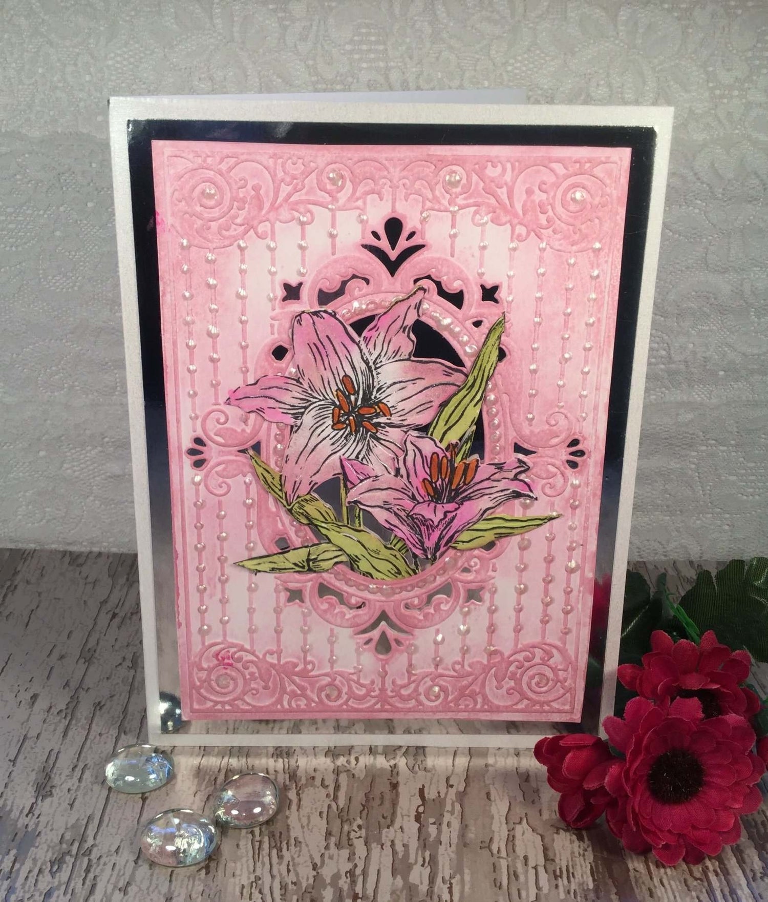 This luxurious design includes intricately embossed and die-cut elements to create a full 7x5” frame with a central die-cut panel. Use with dark-coloured cardstock and gilding wax to create a dramatic effect, or create a more contemporary effect using white cardstock and ink pads.