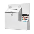 Free standing or wall mountable white plastic suggestion box with 110mm wide literature pocket. Includes wall mounting fixings lock and two keys. Ideal for voting slips suggestions raffle tickets comment cards and more. W349 x D92 x H330mm.