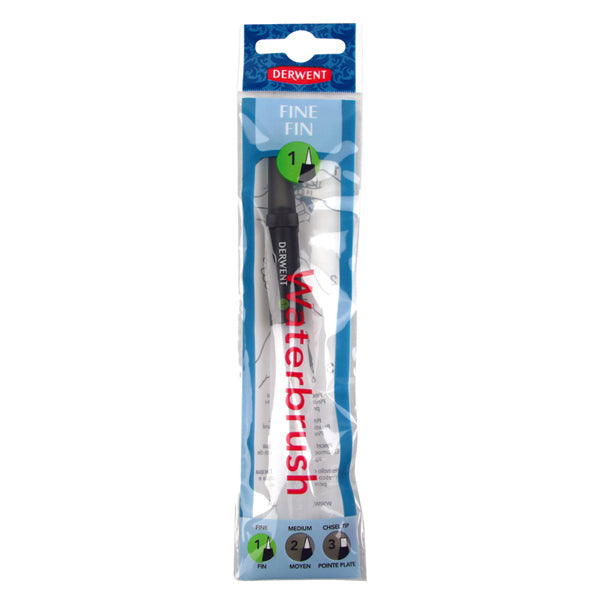Derwent’s waterbrushes have been developed for artists to paint ‘en plein air’. Easy to control water flow with a non drip valve, these brushes are portable, leak proof and easy to clean. Available in 3 Sizes: No 1 Fine tip, No 2 Medium tim and No 3 Chisel tip. Each head is easily distinguished by it number. Also available as a pack of 3