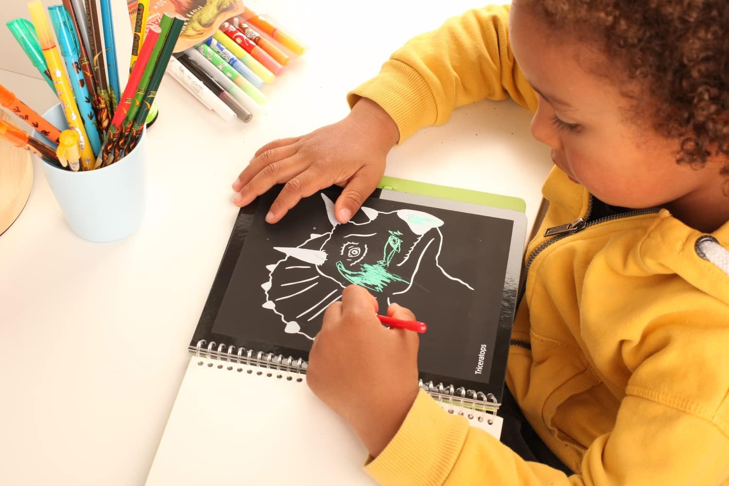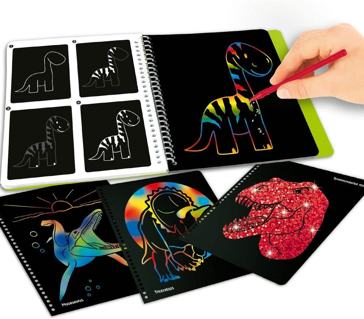 The Dino World Magic Scratch Book allows kids to create custom artworks with the included pen. Simply scratch away the top layer of black paint to reveal a stunning array of vibrant rainbow colors and fantastic gradients.