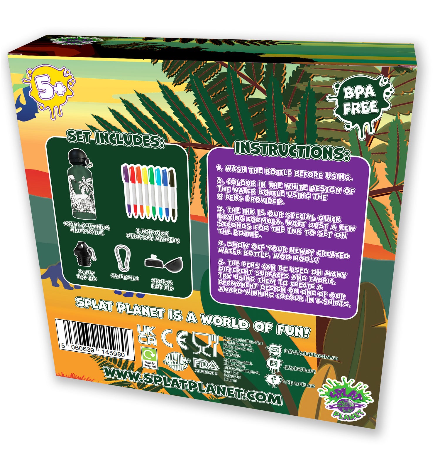 Colour in the white dinosaur design of the water bottle using the 8 pens provided. The ink is our special quick drying formula, wait just two seconds for the ink to set on the bottle!