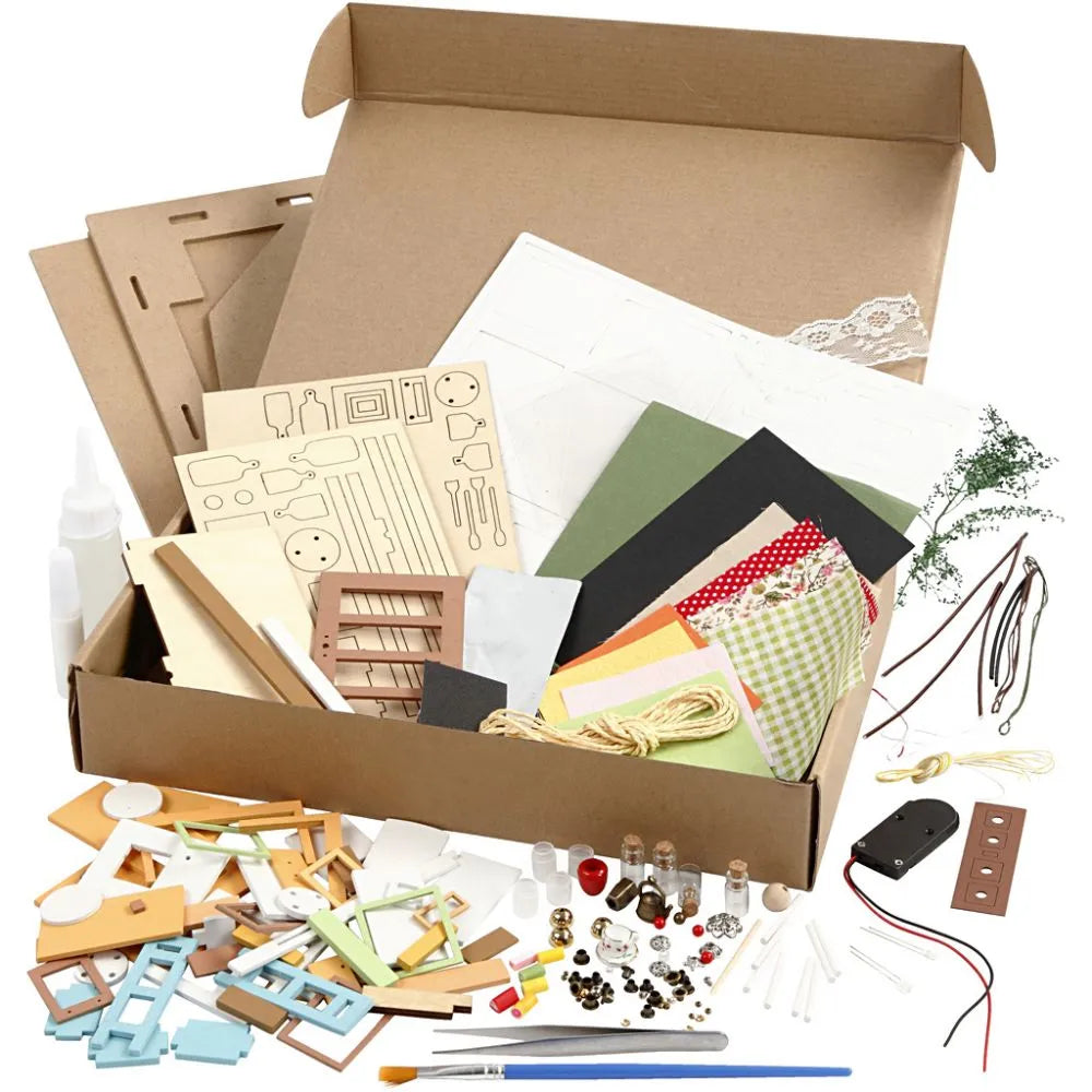 Includes: Wooden parts for kitchen and furniture, small decorative items such as tableware and a lamp with a light bulb (including batteries). In addition - eg tweezers, glue, paint and brushes.