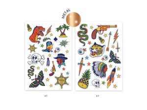 Two sheets of temporary tattoos featuring children's popular themes, such as Western, dinosaurs, animals, and skulls, provide something to please everyone!