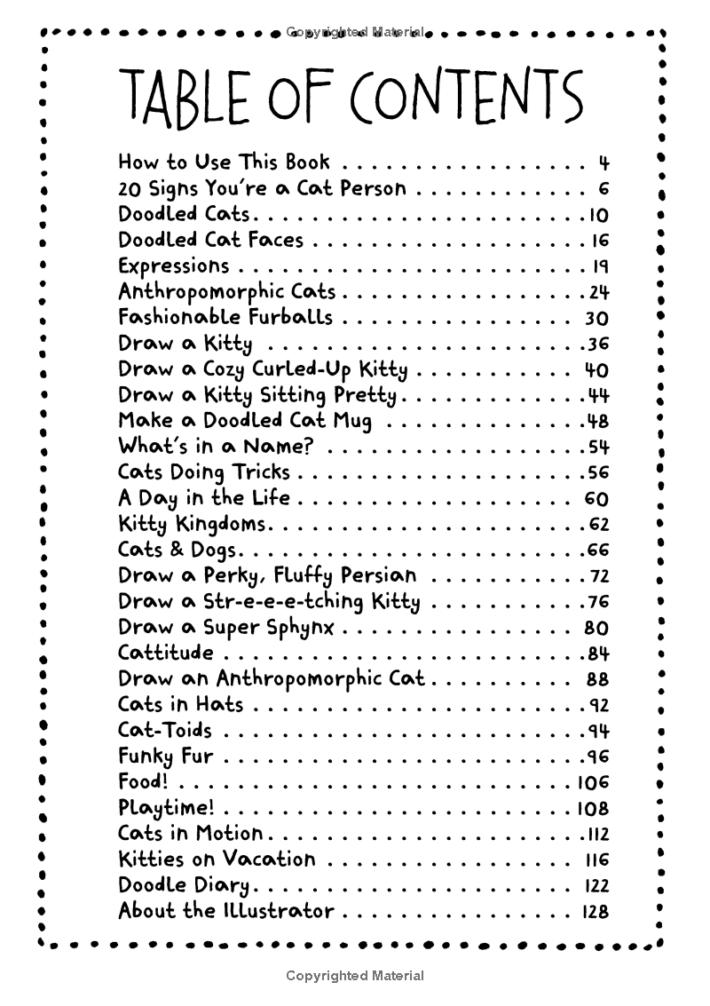 This book is designed to get your creative juices flowing—and your pen and pencil moving! Don’t think too much about the prompts; just start drawing cat-related doodles and see where your imagination takes you. There’s no such thing as a mistake in doodling!