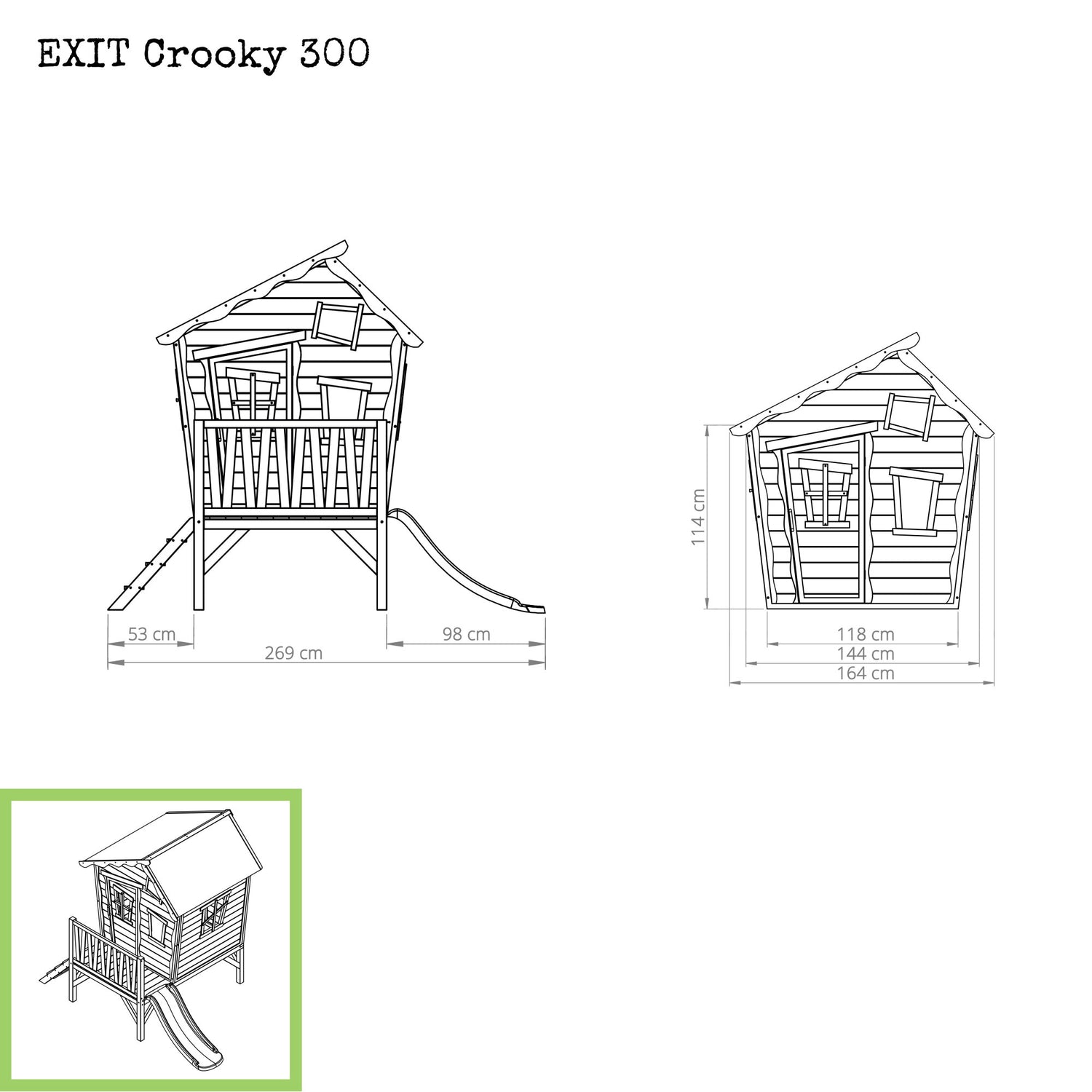 The EXIT Crooky 300 wooden playhouse with slide has a natural look and a playful design with, among other things, sloping windows, a sloping roof and a sloping door.