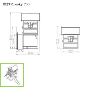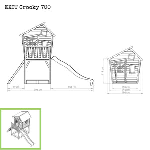 The EXIT Crooky 700 wooden playhouse with slide and sandpit has a natural look and a playful design with, among other things, sloping windows, a sloping roof and a sloping door.
