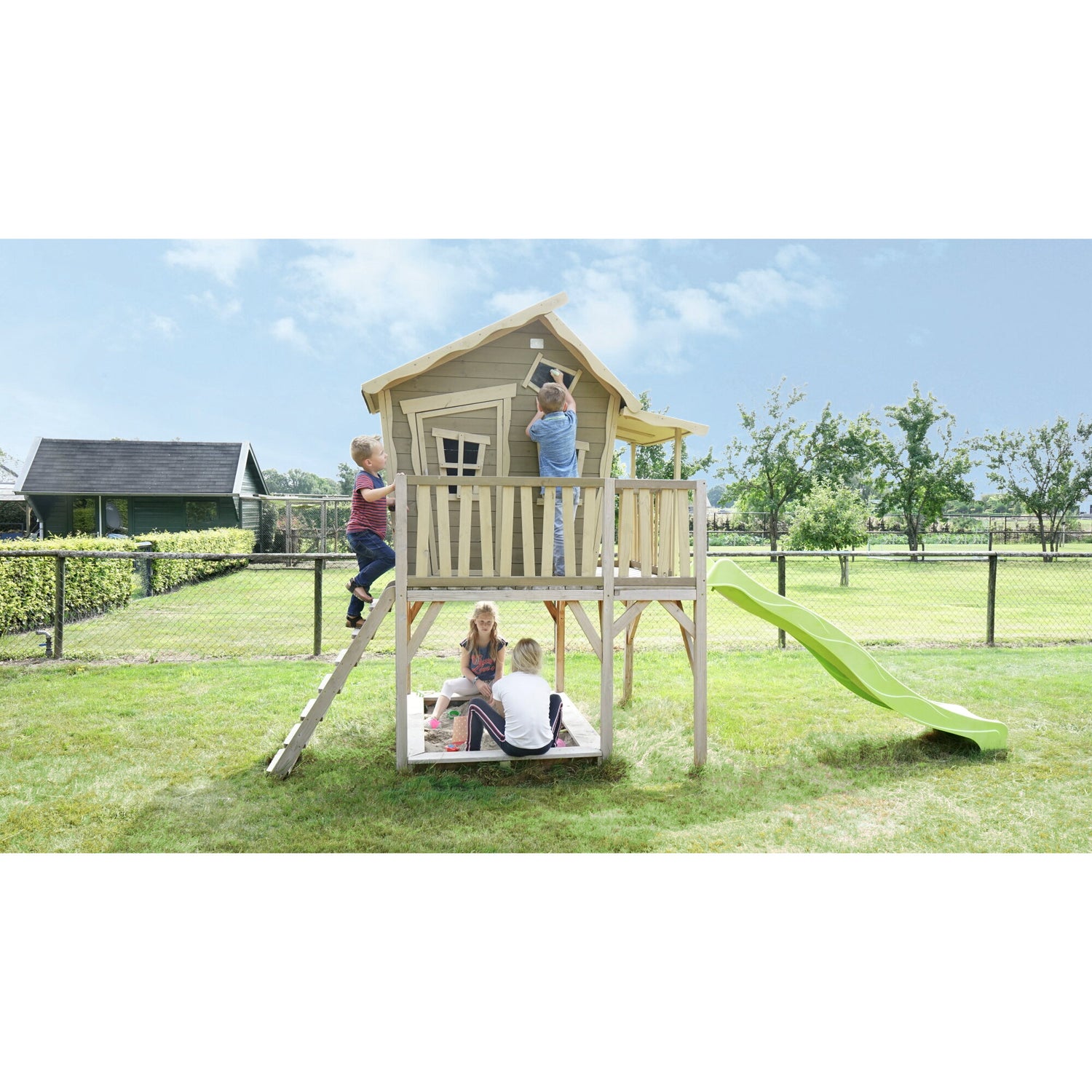 The EXIT Crooky 750 wooden playhouse - Grey/Beige is an extra high, sturdy 'log cabin' with slide and sandbox. It has a veranda, slanted windows, a roof, and door for a natural look and playful design. Easy to assemble with pre-assembled panels.