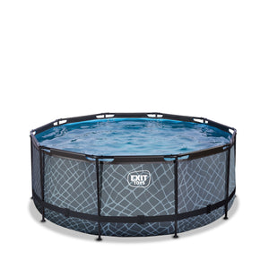 The EXIT Stone Pool is a round pool with a sand filter pump and ladder for safe entry and summer fun.