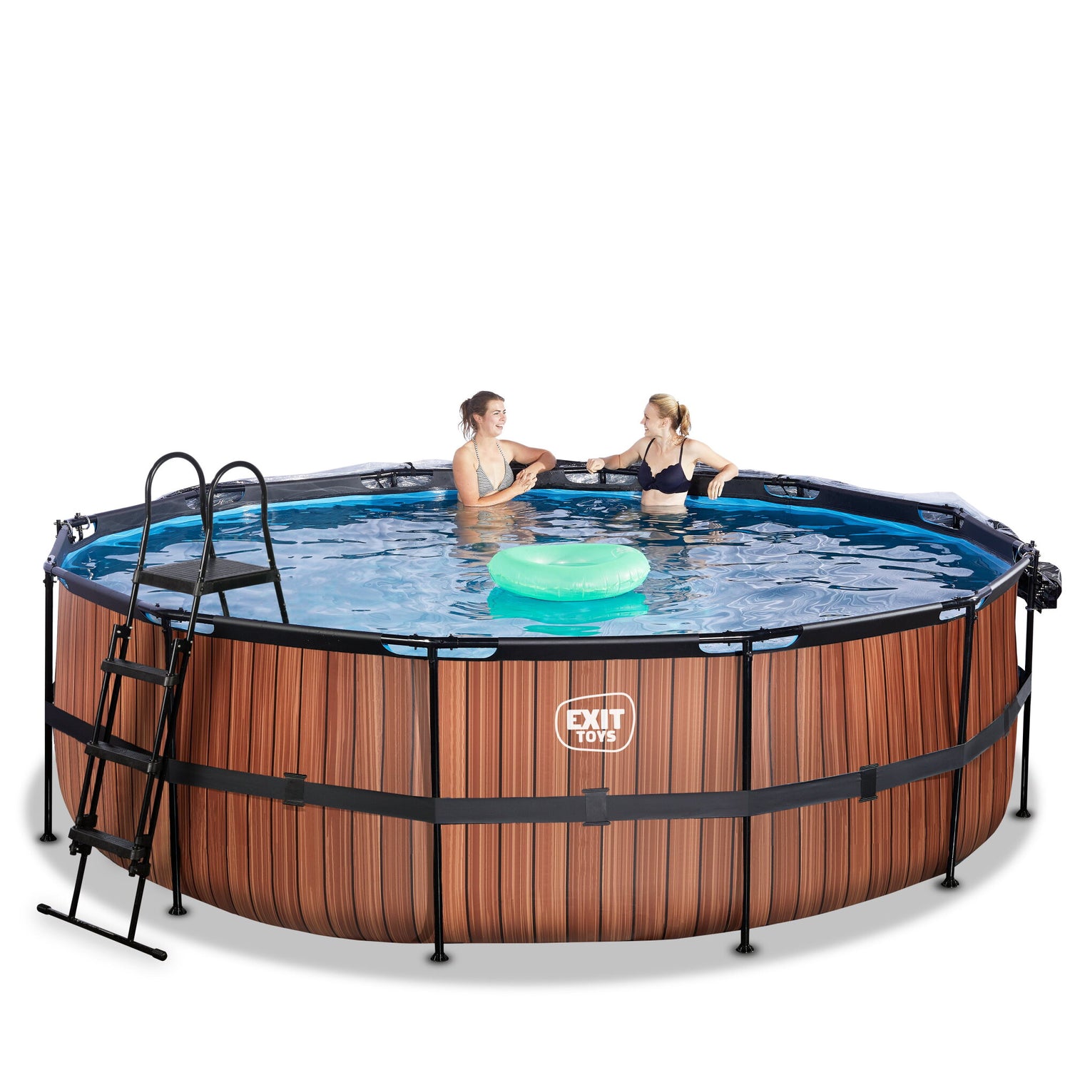 The EXIT Wood pool is a round frame pool with a wood look, sand filter pump, and standard pool ladder for safe entry and exit.