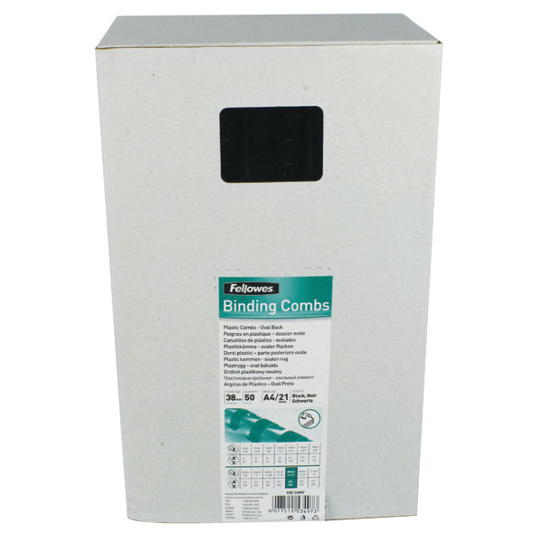 Fellowes Plastic Binding Combs 21 oval ring with a comb length of 30cm. Colour - Black 38mm (281-340 80g sheet capacity). Pack 50.