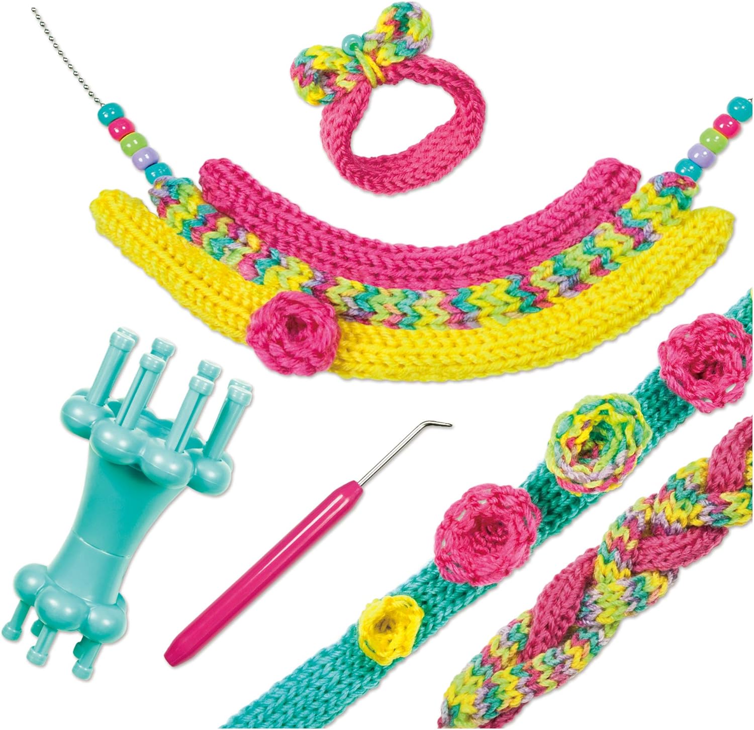 • Contents: 8 x 10g balls of wool, double sided French knit spool, knitting needle, 60 pony beads, ball chain, bodkin and instructions.