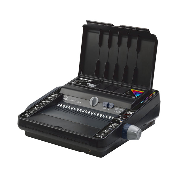 GBC MultiBind 230E Comb Binder Machine 4400424 Punches up to 30x80gsm sheets. Binds 450x80gsm sheets with 51mm comb, 125 sheets with 21 loop wire. Binds A5, A4 Portrait, A3 Landscape. Electric punch. Quickstep process. Auto centering. 2 year guarantee.