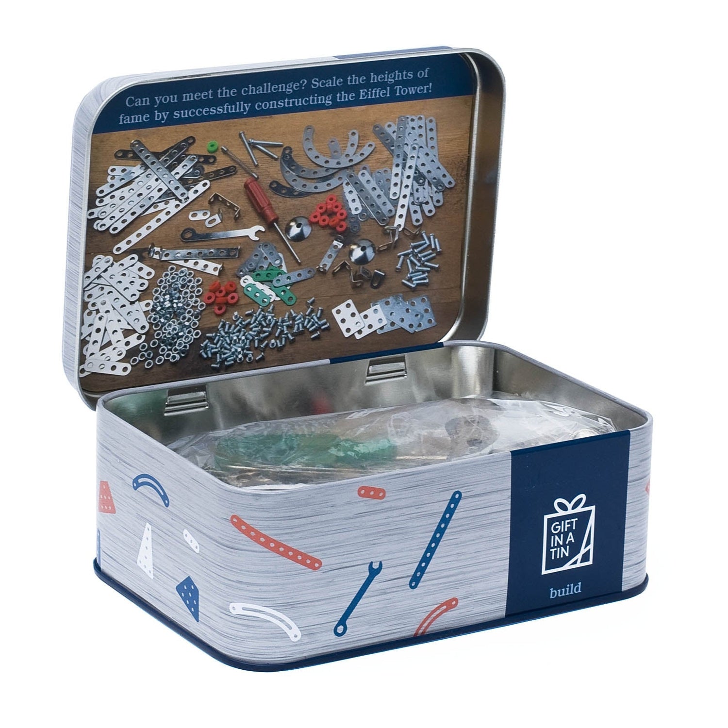 The set contains full instructions and an Eiffel Tower quiz sheet, all housed in its stylish metal tin.