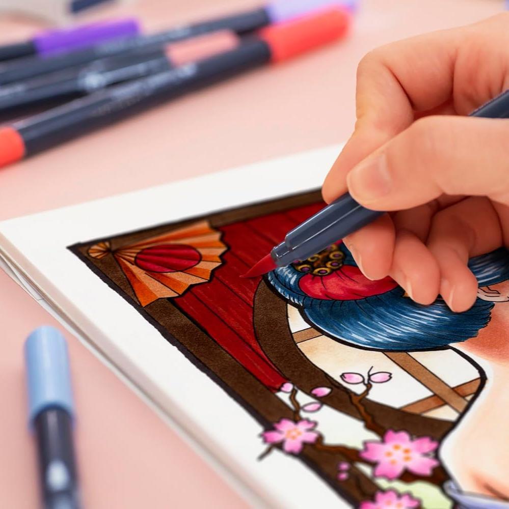 - Soft, flexible brush nib for areas and variable line widths and metal-encased fineliner tip (0.6) for contours and details