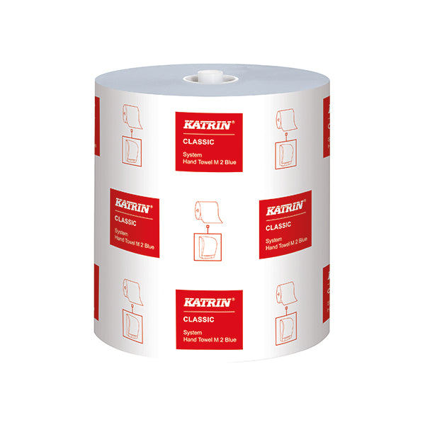 Katrin Classic System Hand Towel M2 2-Ply Blue. Extremely absorbent mixed fibre paper for effective drying. 2-ply thickness. Flat sheets are fed out in the right size. Zero wastage with all the roll used up.