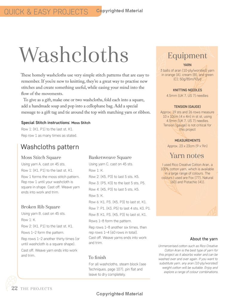 The projects themselves are split into five sections: Quick and Easy, Portable, Group, Big, and New Skills. Within these sections, you can choose to make things such as a wash cloth, a hat, a blanket, a shawl and an evening bag, amongst others.
