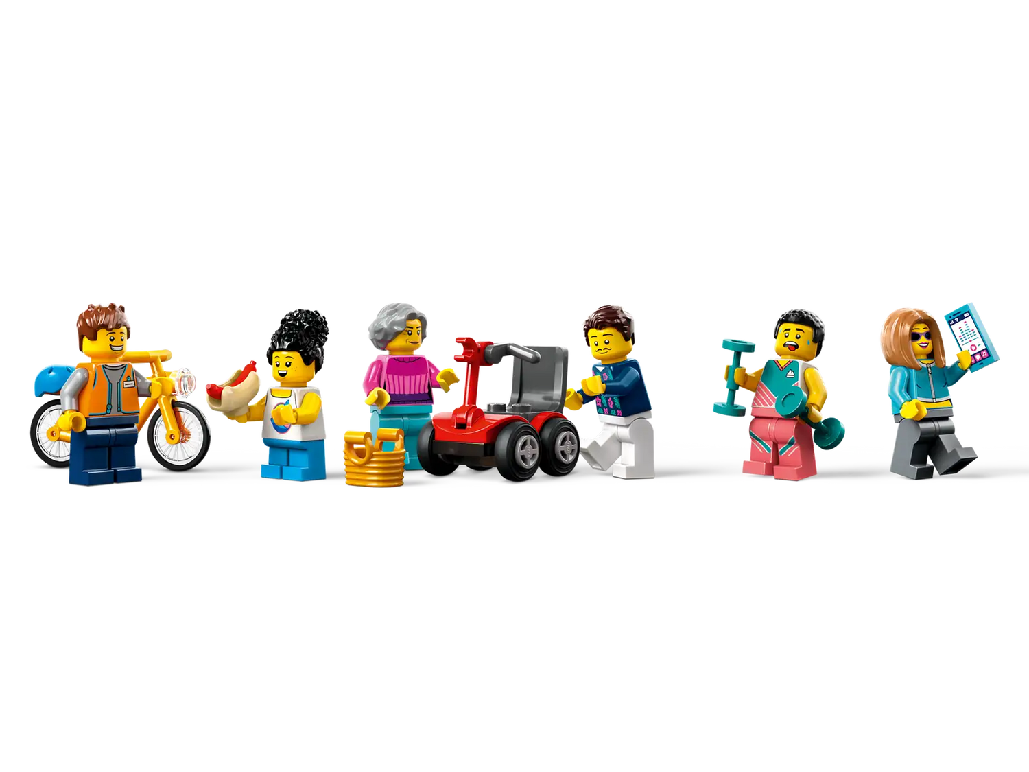 - What’s in the box? – This set includes a toy apartment block with pretend solar panels, a convenience store, living room, kitchen, bedroom and bathroom, plus a bike, mobility scooter and 6 minifigures