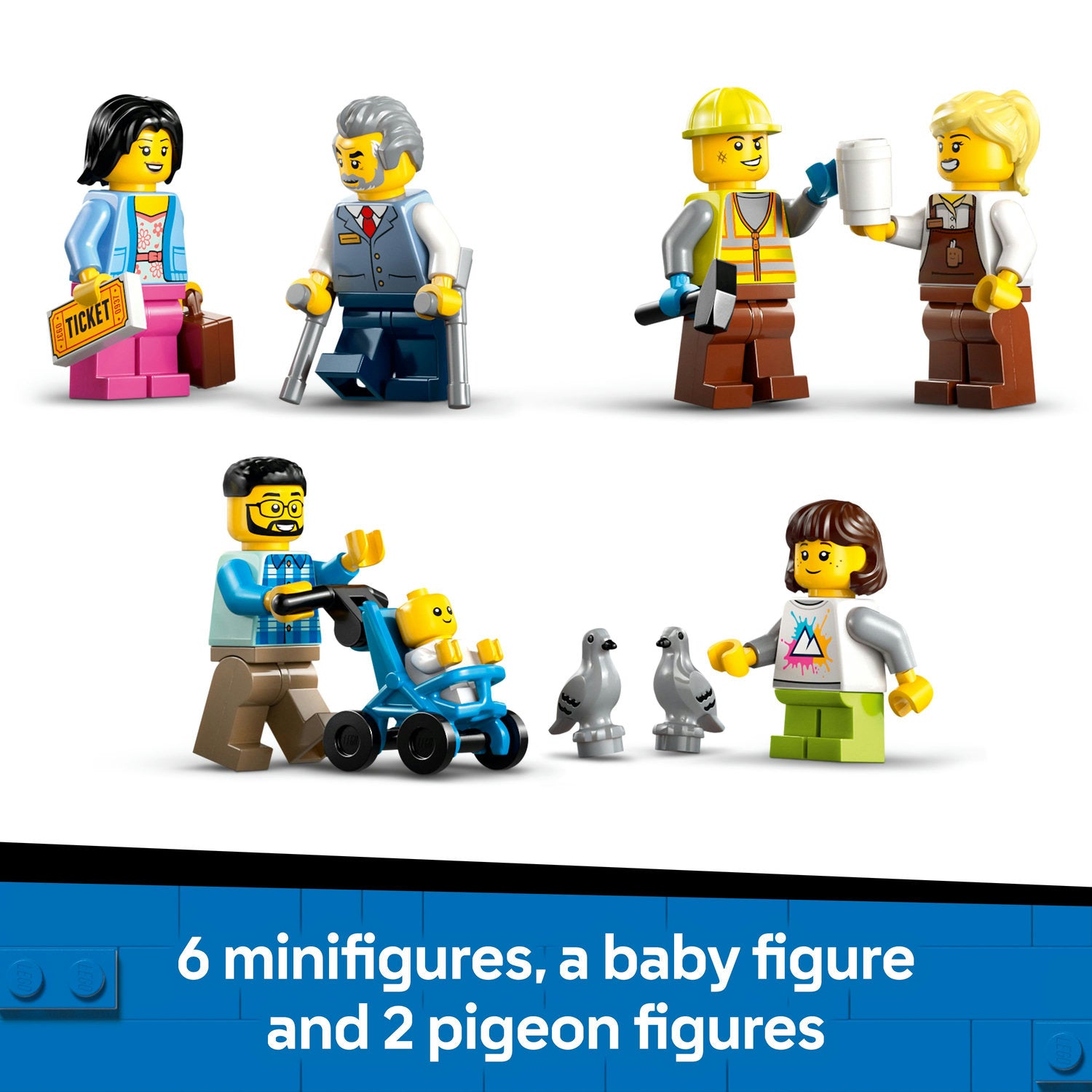 Topped with a classic clock tower, the toy station includes a cosy coffee bar, working lift, control room, bus stop, 2 passenger platforms, a timetable display and a ticket machine. Kids also get a railway maintenance vehicle with a cherry picker, plus 6 minifigures, a baby figure and 2 pigeon figures for role play and storytelling.