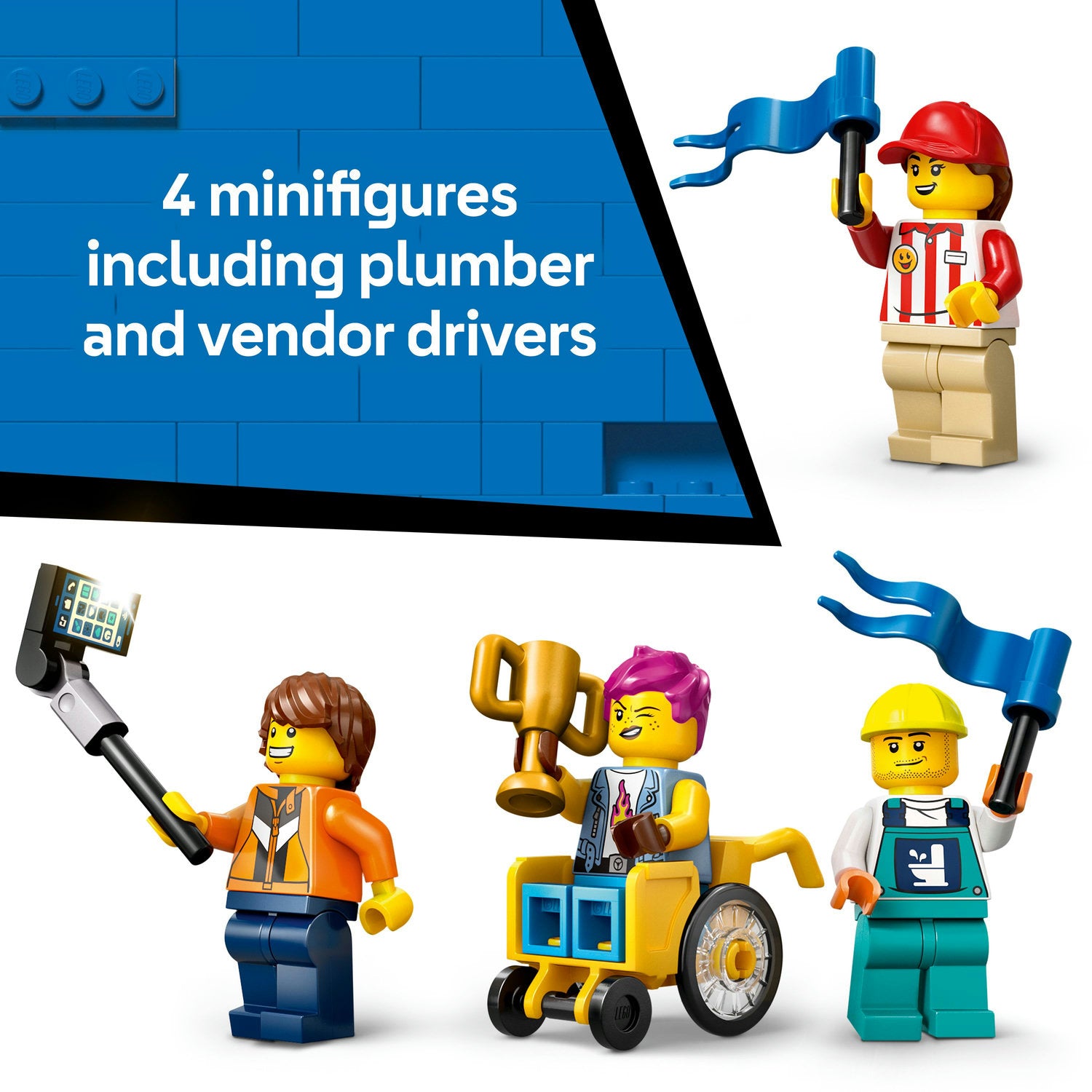 Complete with 4 minifigures, including hot-dog vendor and plumber drivers, this set inspires imaginative play and storytelling.