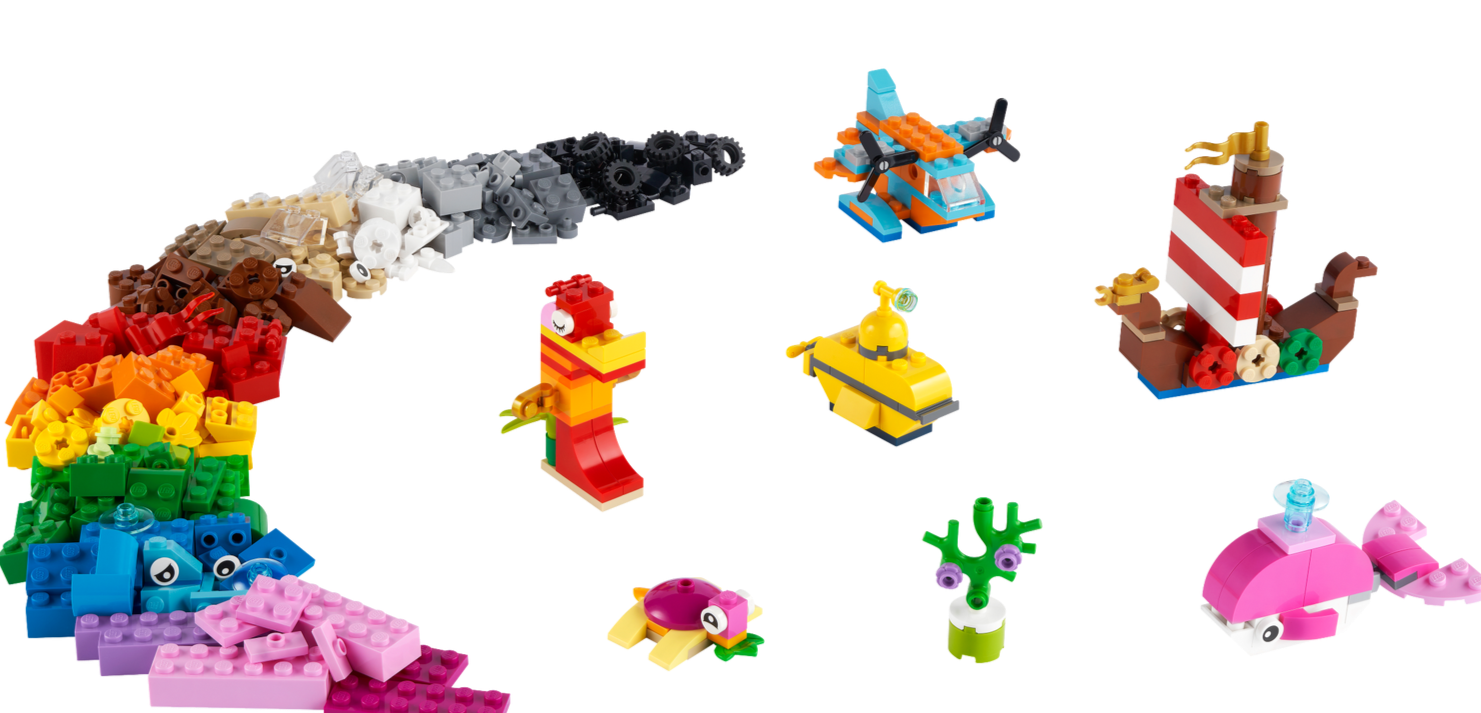 Introduce youngsters to the open-ended world of imaginative play with the LEGO Classic Creative Ocean Fun (11018) creative construction toy for kids 4+ years old, featuring a colourful selection of LEGO pieces and 6 inspiring ocean-themed build ideas to kick-start the fun, plus 2 bags of extra bricks for free building.