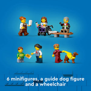 This set also features 6 minifigures for role play and storytelling, including a character with a guide dog and a character with a wheelchair.