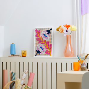 1 picture, 3 choices, many artistic possibilities. Open the box and discover the creative options inside. Choose the flowers and color variants, then design, create and show them off. Finish the art with a brick-built frame in white, then display it with pride on a wall or shelf.
