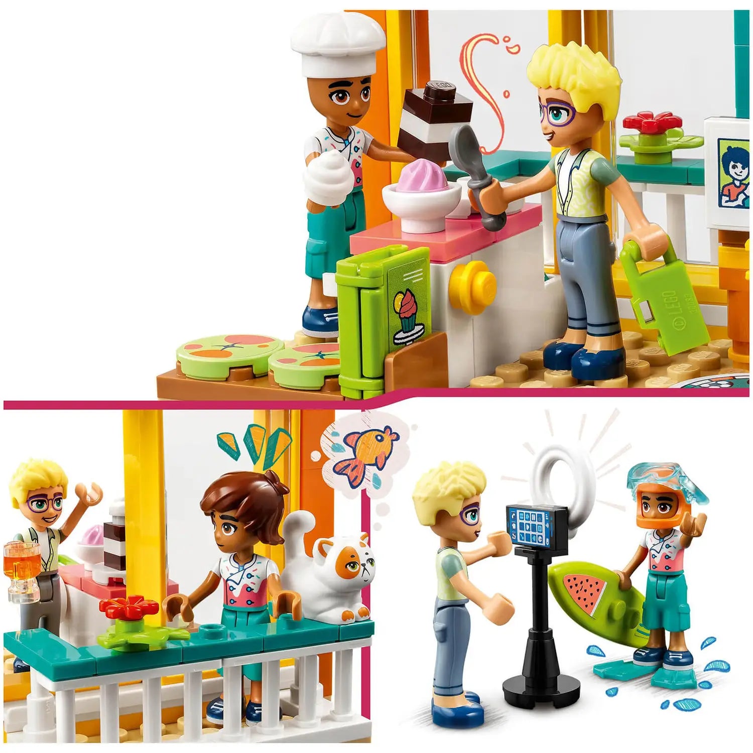 There are lots of features and mini doll accessories to inspire role play, including a LEGO Friends toy pet cat, cookbook and camera. When filming is finished for the day, kids can open the balcony doors so the friends can enjoy seaside views from the beach-themed bedroom.