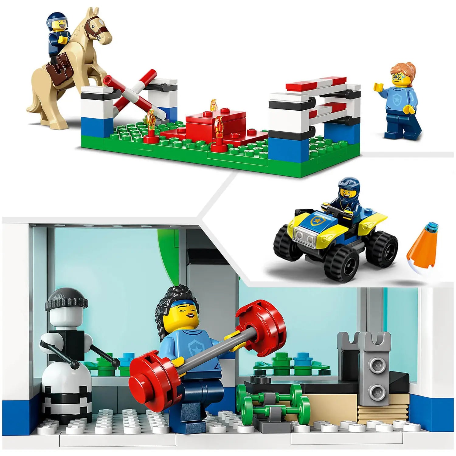 The LEGO City Police Training Academy (60372) toy for kids features a modular multi-room police station and an outdoor obstacle course with fun facilities, a steerable quad bike toy, 6 minifigures and a horse toy figure.