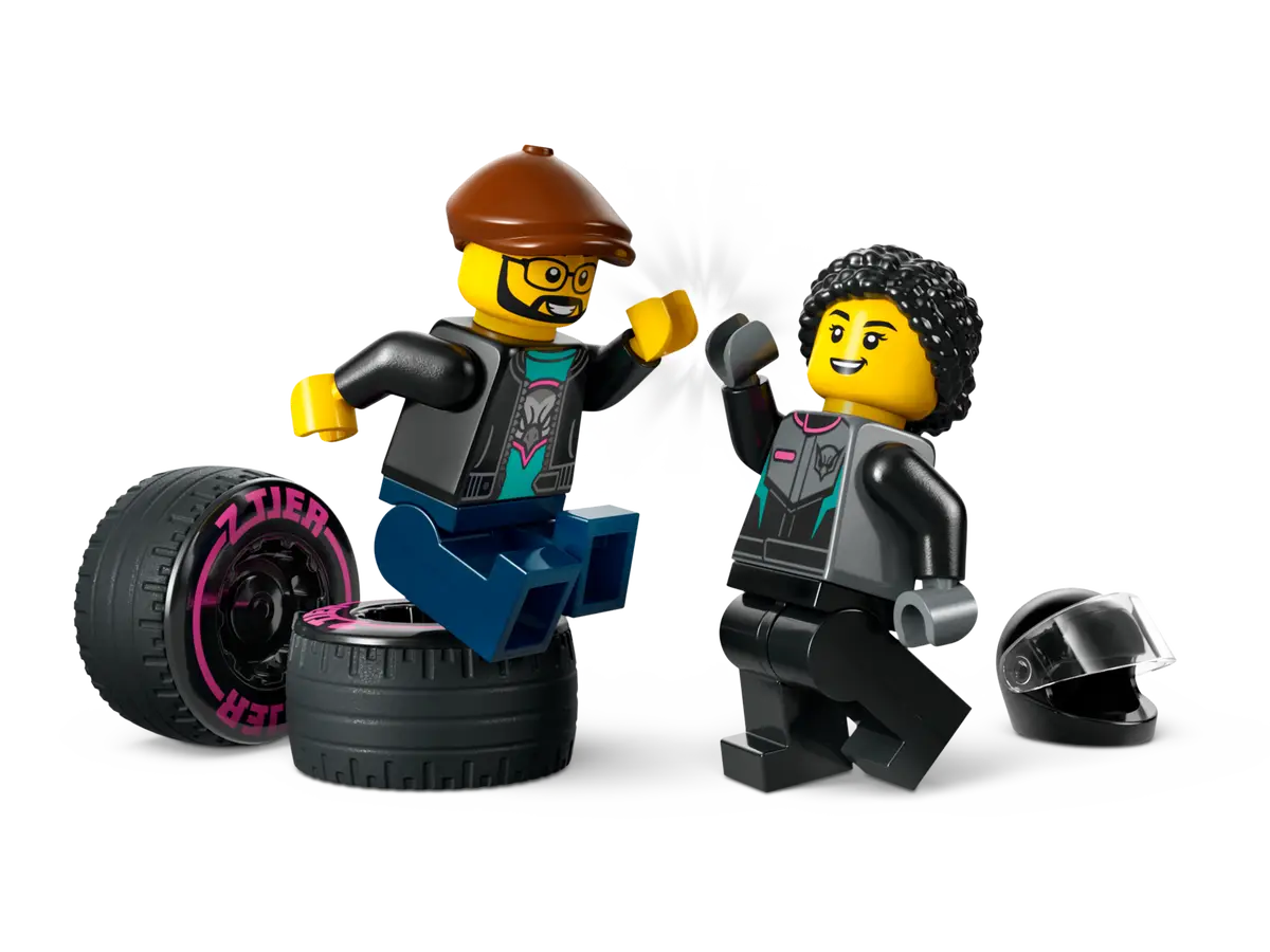 The set also includes racing driver and truck driver minifigures for role-playing fun stories and adventures.