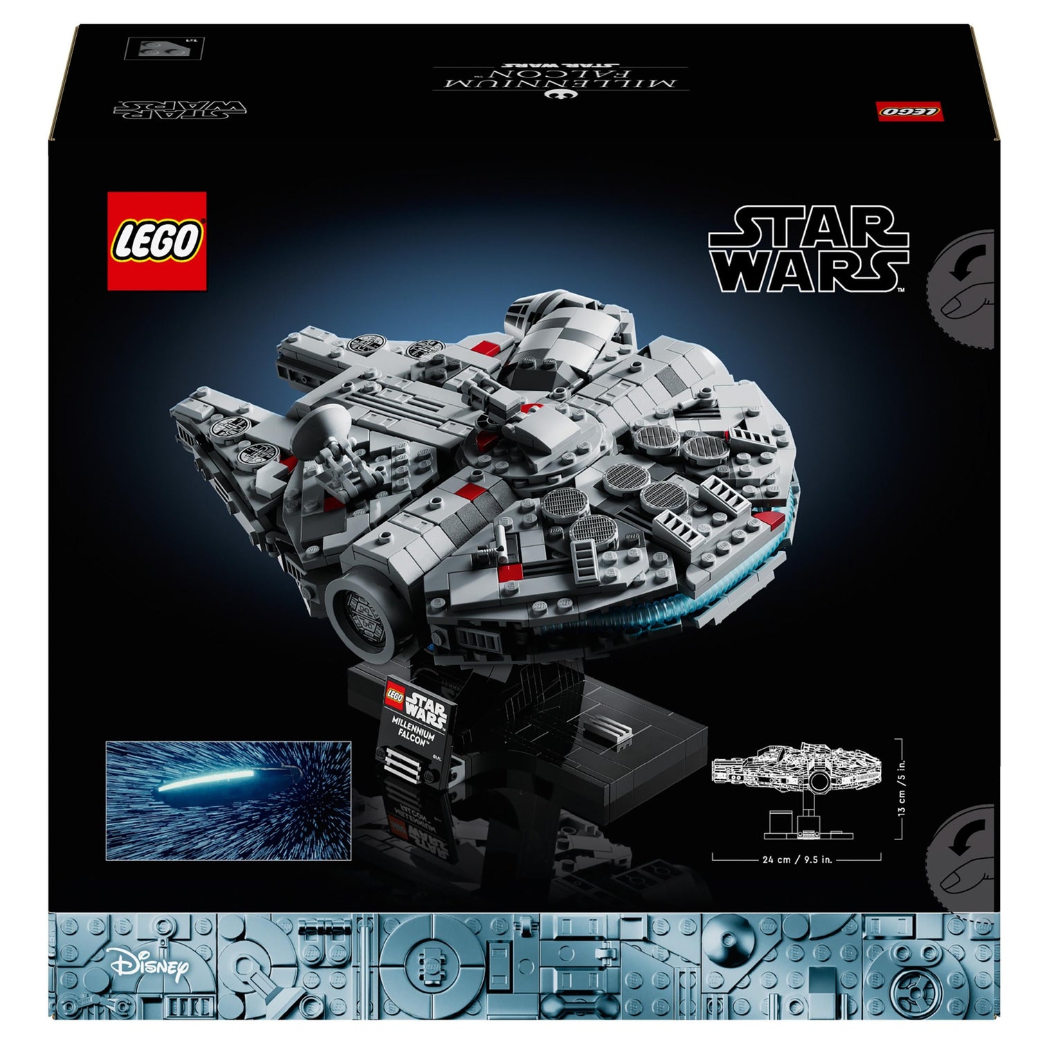 - Build and display – This LEGO® Star Wars™ Millennium Falcon starship measures over 13 cm (5 in.) high, 24 cm (9.5 in.) long and 19 cm (7.5 in.) wide