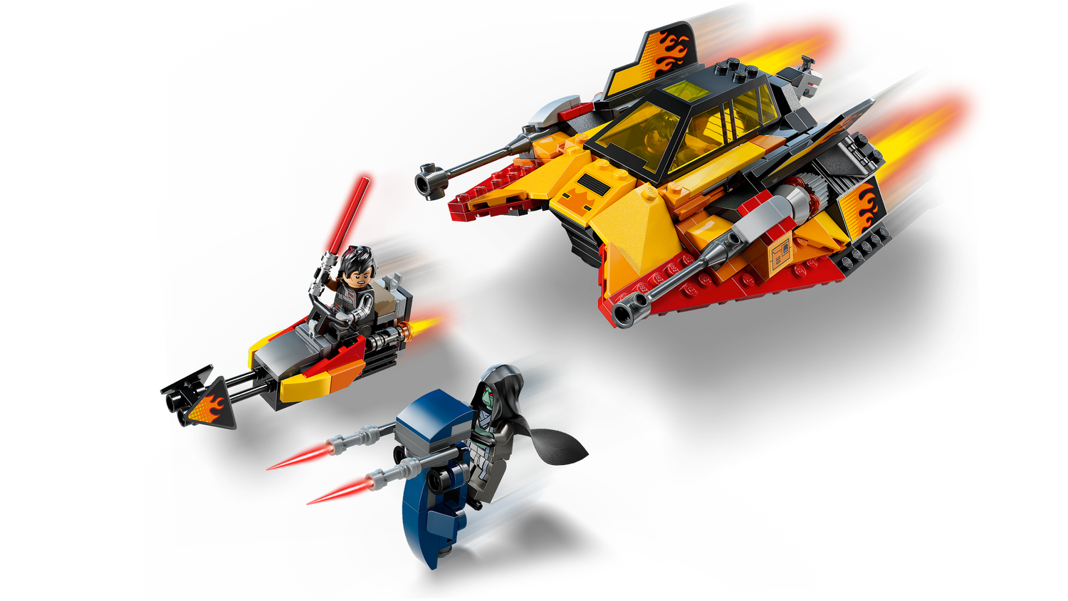 It’s got eye-catching flame decals, an opening double cockpit with a hidden, detachable speeder bike, and a rear stud shooter. Press down on the seat in the back of the cockpit (or the head of the LEGO minifigure sitting in it) to release the speeder bike.