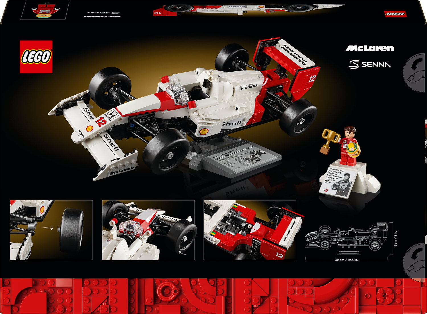 - What’s in the box? – This creative building set includes everything you need to craft an in-scale replica of the McLaren MP4/4, plus display stands for the racing car and the Ayrton Senna minifigure
